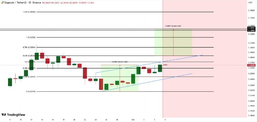 DOGE/USDT在0.25美元附近呈上升通道形态,0.24美元强支撑下或突破至0.32-0.38美元。来源:TradingView上的BeInCrypto