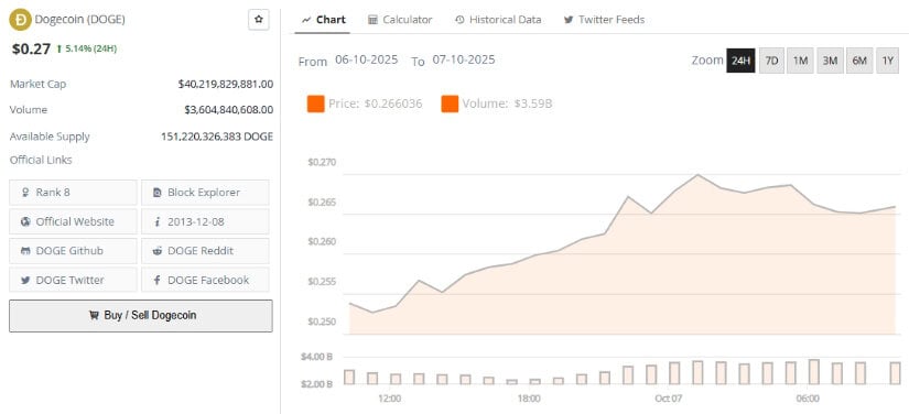 截至发稿狗狗币报0.27美元,24小时涨幅5.14%。来源:Brave New Coin