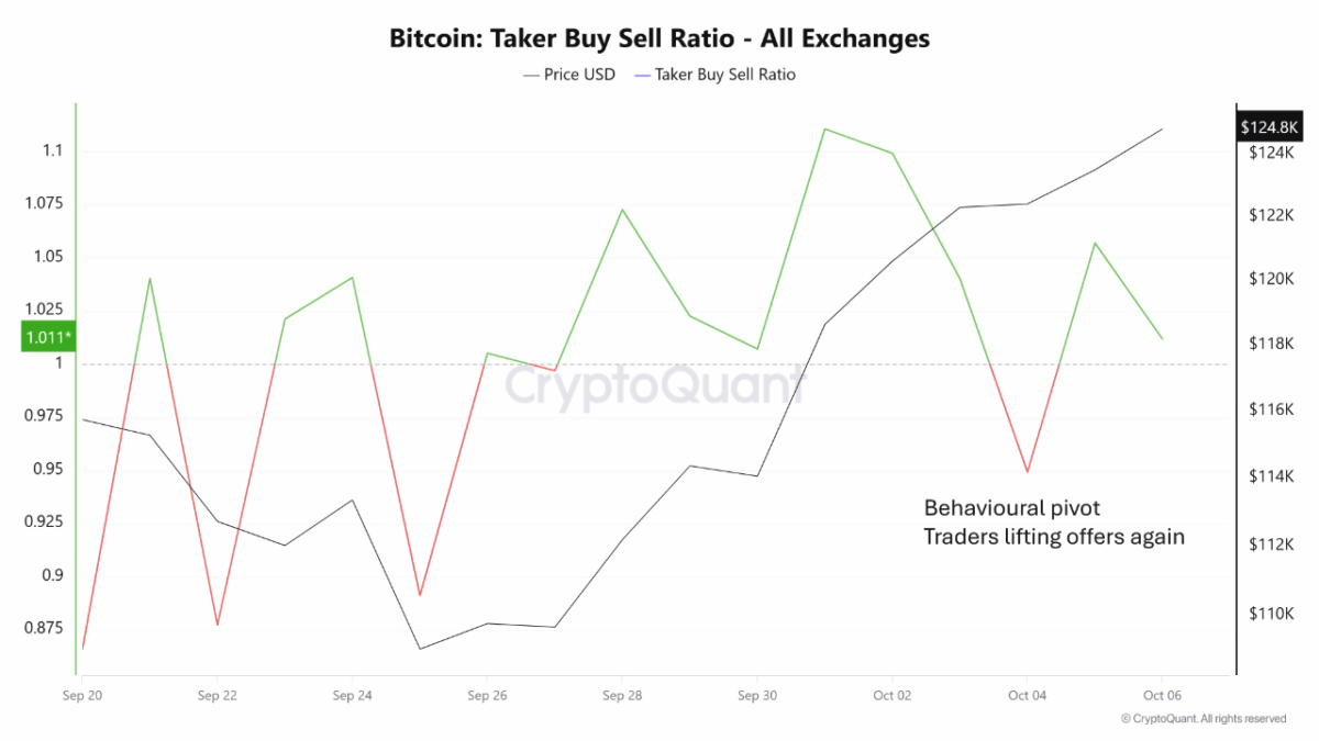 9月下旬该比率曾低于1,意味着卖方占据优势。如今形势逆转,交易者正以现价买入而非等待更低点位。这通常是短期内价格可能延续涨势的积极信号。