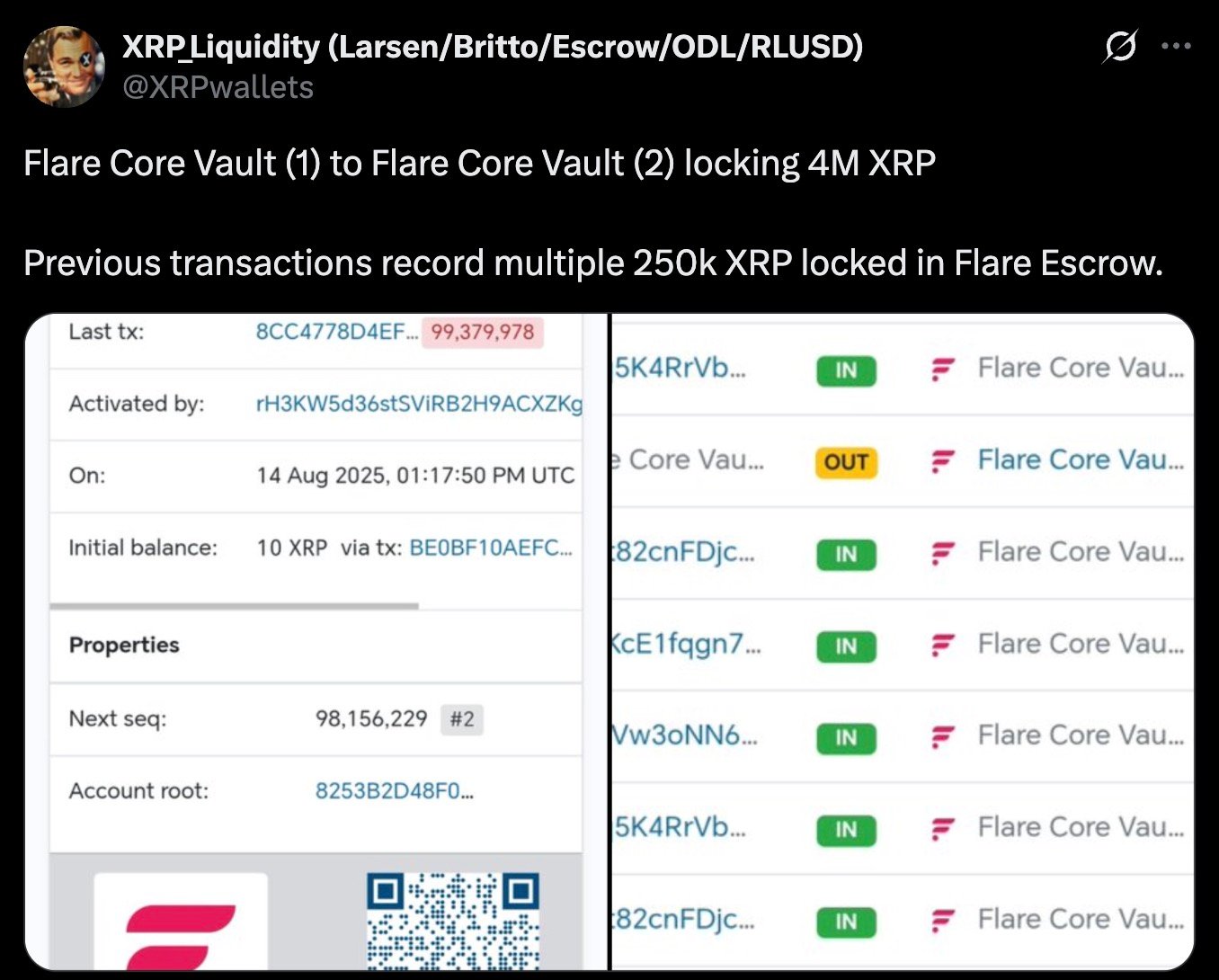 本次托管背后的钱包可能并非完全随机。据XRPWallets账户追踪,该地址与Flare项目关联——该项目旨在为非智能合约链引入智能合约功能,XRP是其最早整合的标的。