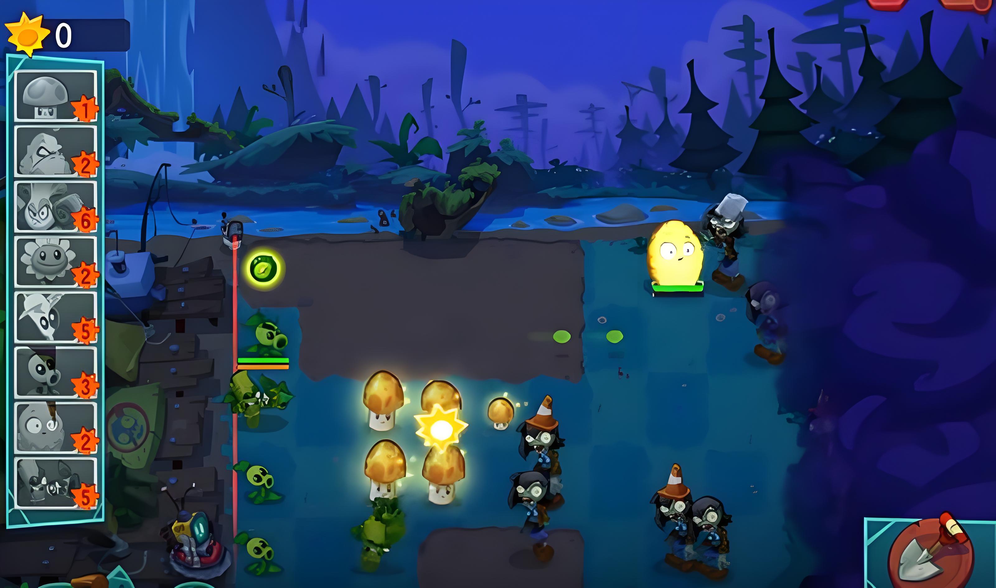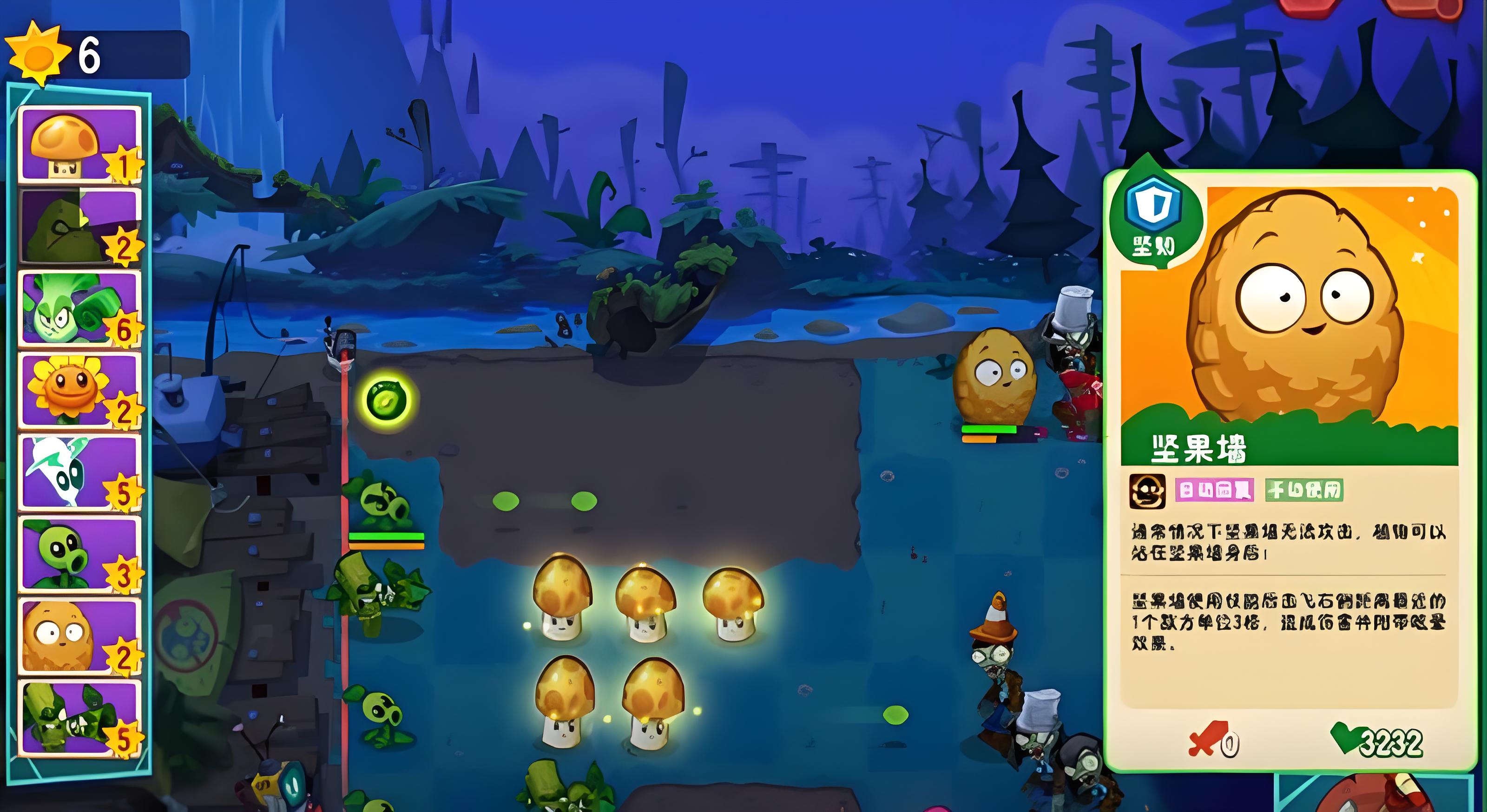 2、前排首选坚果墙,拥有4000点生命值且阳光消耗仅2点性价比高,部署在第一排可阻挡僵尸前进,25秒冷却能反复使用。