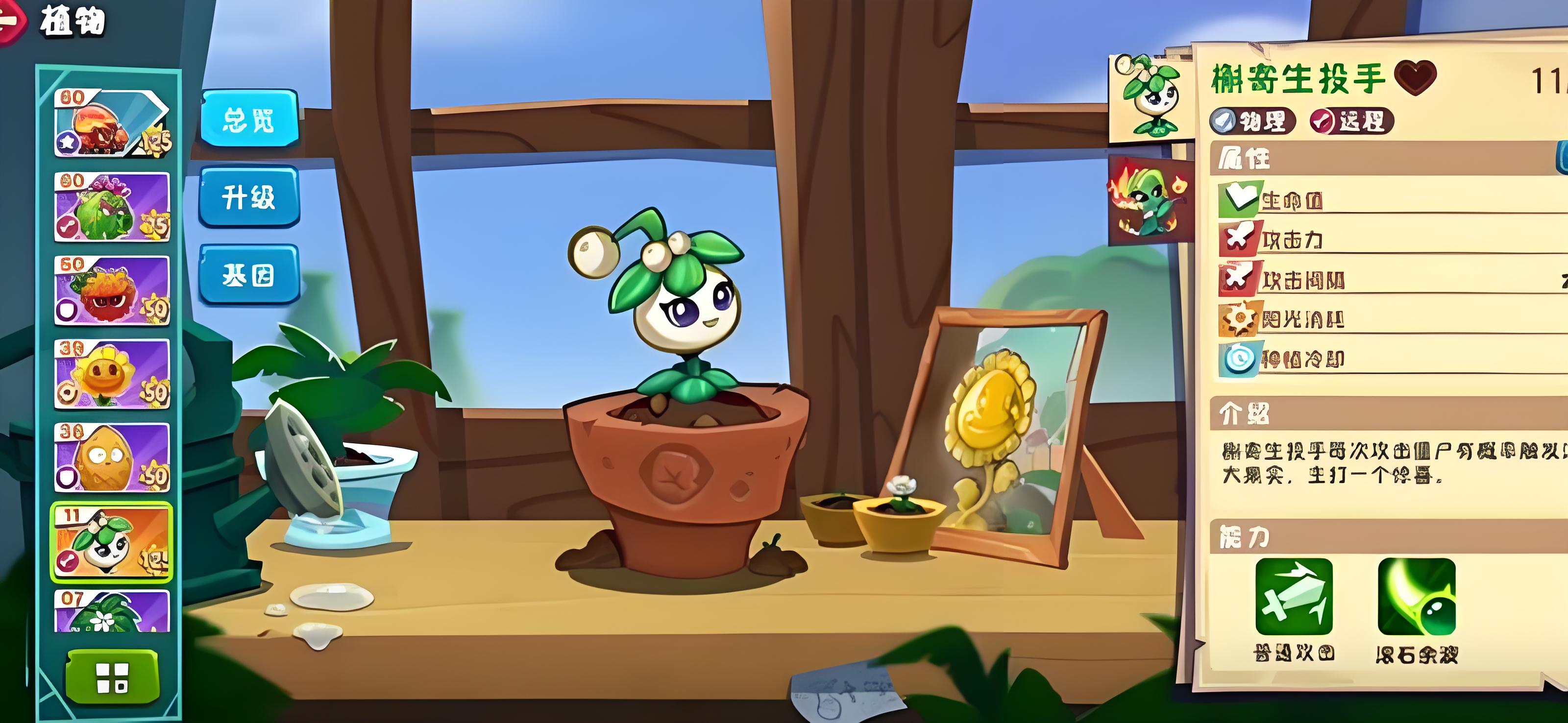 4、辅助输出选槲寄生投手,进化后发射火球附带持续灼烧效果,技能触发随机范围伤害,与爆竹火枪手输出互补加快高血量僵尸清理速度。