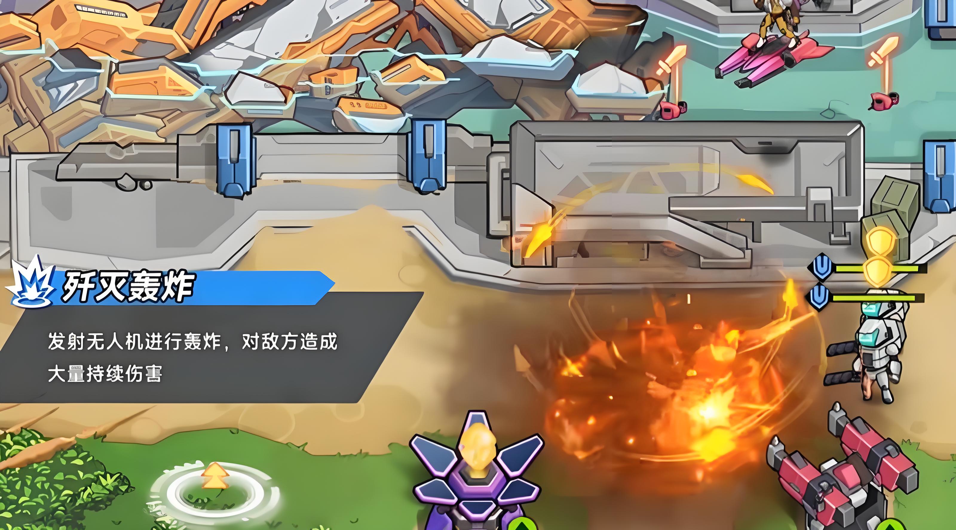 1、核心技能歼灭轰炸召唤无人机对指定区域空中打击,对飞行敌人有天然优势,能遏制空中攻势减少防御塔损耗,是少见对空特化输出。