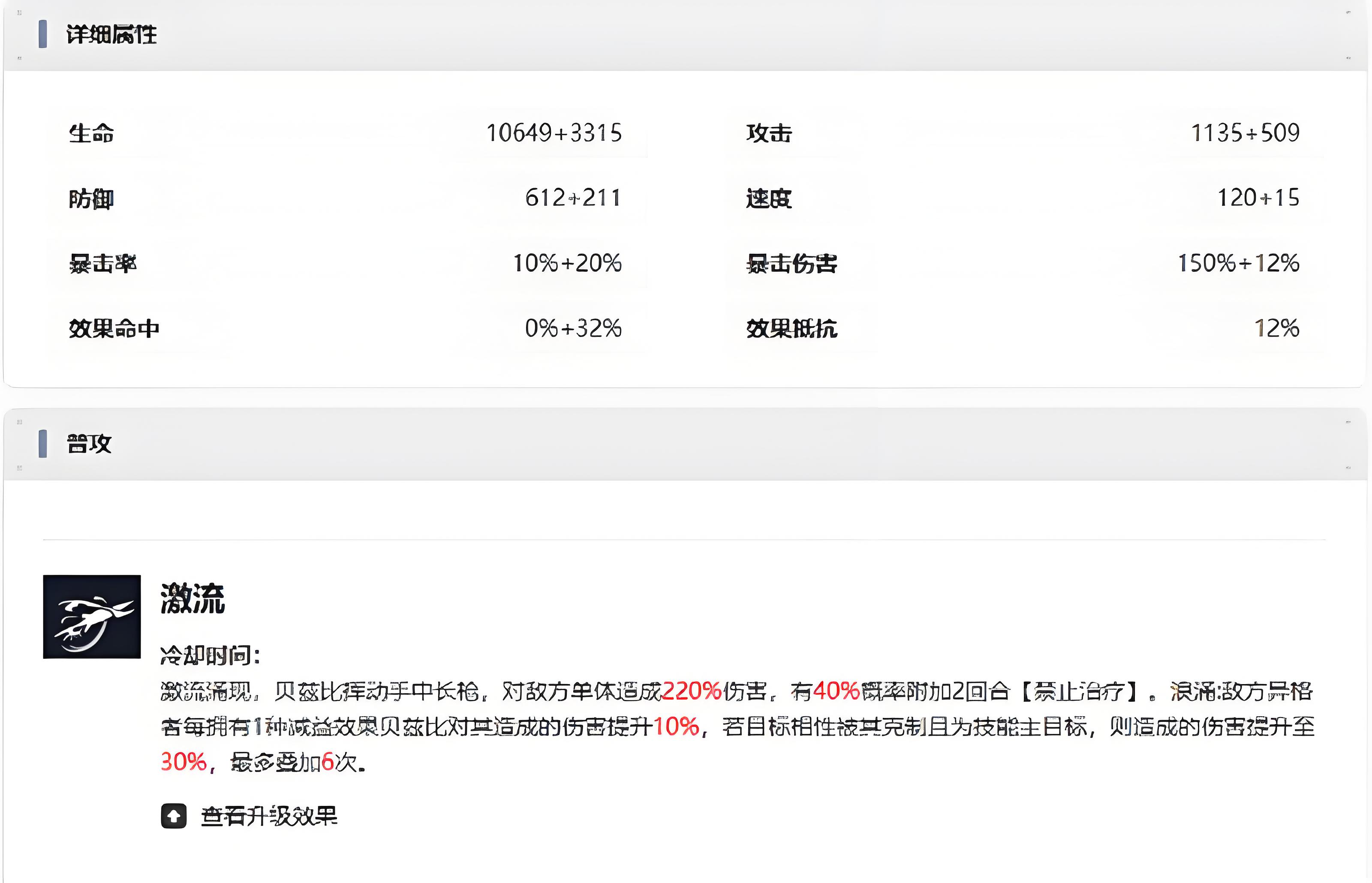 2、核心属性亮眼,生命值10649加3315,攻击力1135加509,防御力612加211,速度120加15,各项数值支撑其稳定发挥。