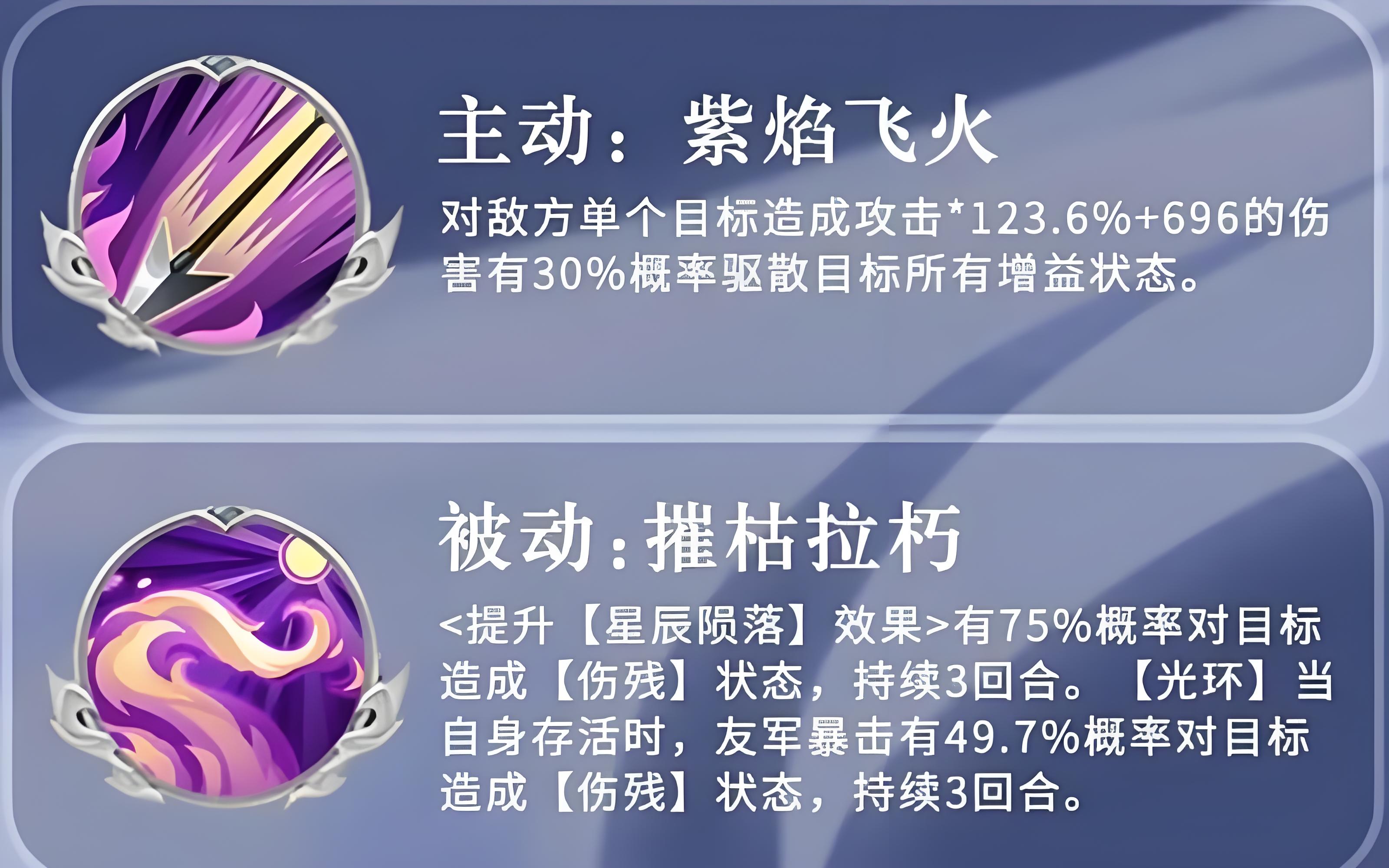 1、主动技能星辰陨落对单个敌人造高物伤,加暴击率与伤害加成,有概率降目标命中率,开局用可建优势精准斩脆皮。