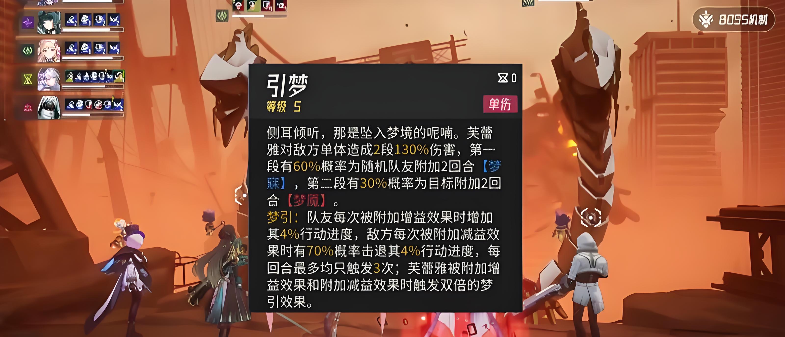5、梦寐状态让队友获增益时加4%行动进度,敌方获减益时70%概率退4%行动进度,梦魇为减益状态,技能围绕两者调控战斗节奏,定位辅助增益型角色。