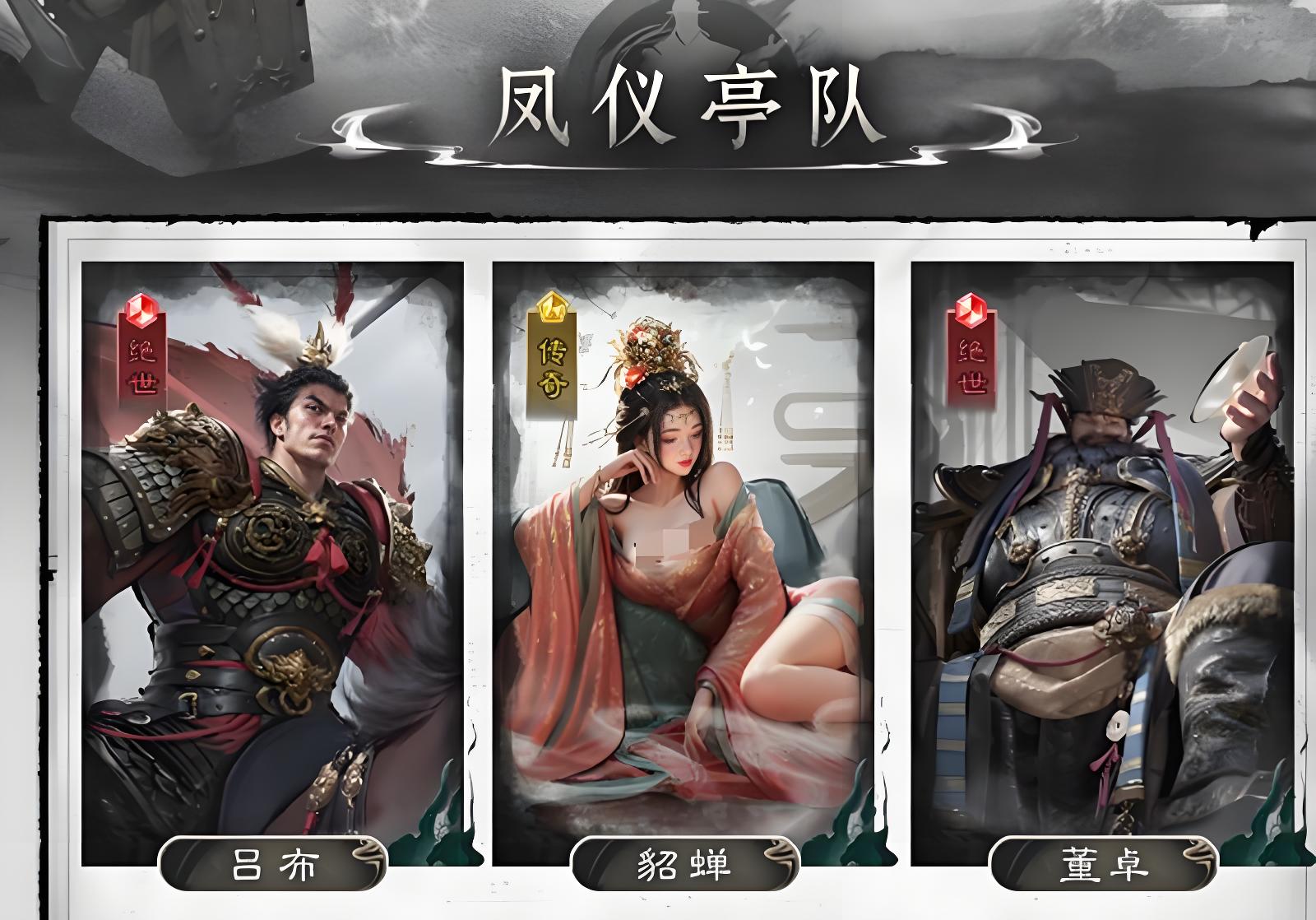 3、凤仪亭队适合微氪玩家,由吕布董卓貂蝉组成,吕布吸武力越战越勇,貂蝉给增益生成护盾,董卓嘲讽吸统帅当前排循环。