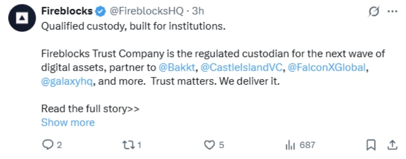 此次合作正值传统金融机构对合规加密货币托管方案需求激增之际。Fireblocks信托公司在纽约州金融服务部(NYDFS)监管下运营,持有银行和投资机构所需的合规资质。