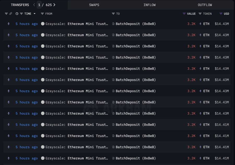 据Lookonchain在X平台披露,这些ETH均被转入同一地址BatchDeposit(0x8eB8)。每笔交易保持3200枚ETH的固定数额,体现灰度对以太坊资产管理的系统性规划。总计2.56万枚ETH的大规模转移,可能预示其以太坊相关产品将进行重大调整。