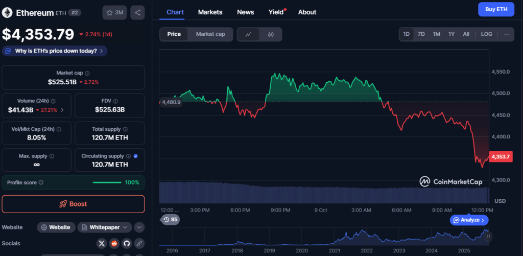 交易规模的稳定性暗示这或是常规资金管理操作,也可能是为大规模机构投资布局。灰度在短时间内转移超1.15亿美元ETH,标志着其资产配置的重大变化。根据CoinMarketCap实时数据,ETH现报4,353.79美元(撰稿时下跌2.74%)。