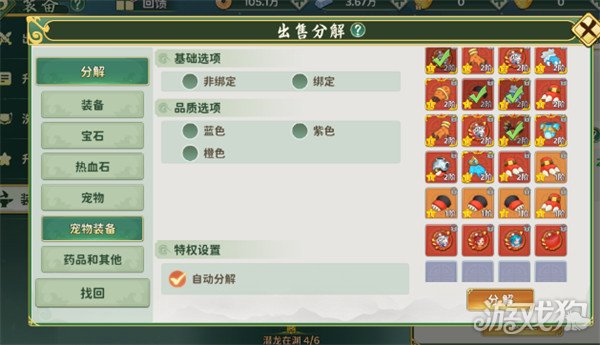 江湖之路,讲究资源的合理运用,所有宠物装备(包括专属装备)都可以进行分解,转化为灵兽银麟(强化经验)、幻兽金核(装备进阶)、珍贵的幻兽星玉(专属装备分解为专属星玉)。