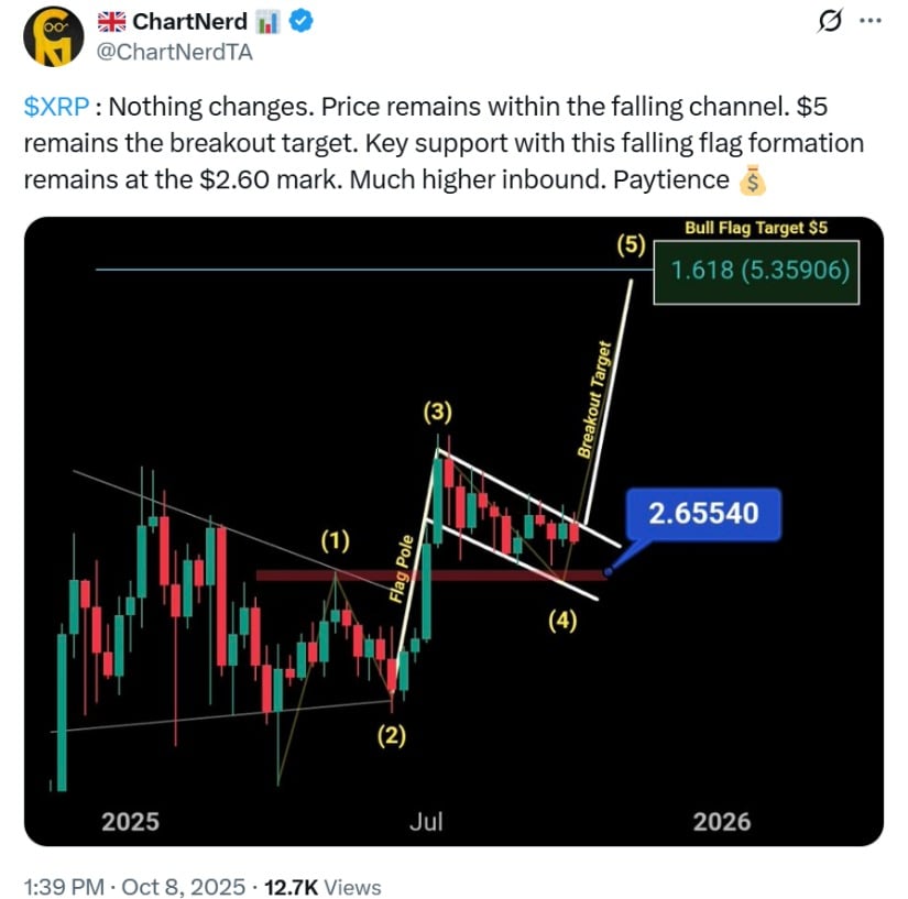 XRP持续在下降通道内交易,守住2.60美元关键支撑位的同时维持5美元突破目标。来源:@ChartNerdTA via X