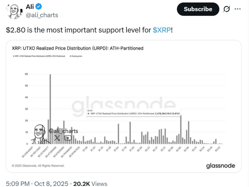 2.80美元仍是XRP关键支撑位。来源:Ali Martinez via X