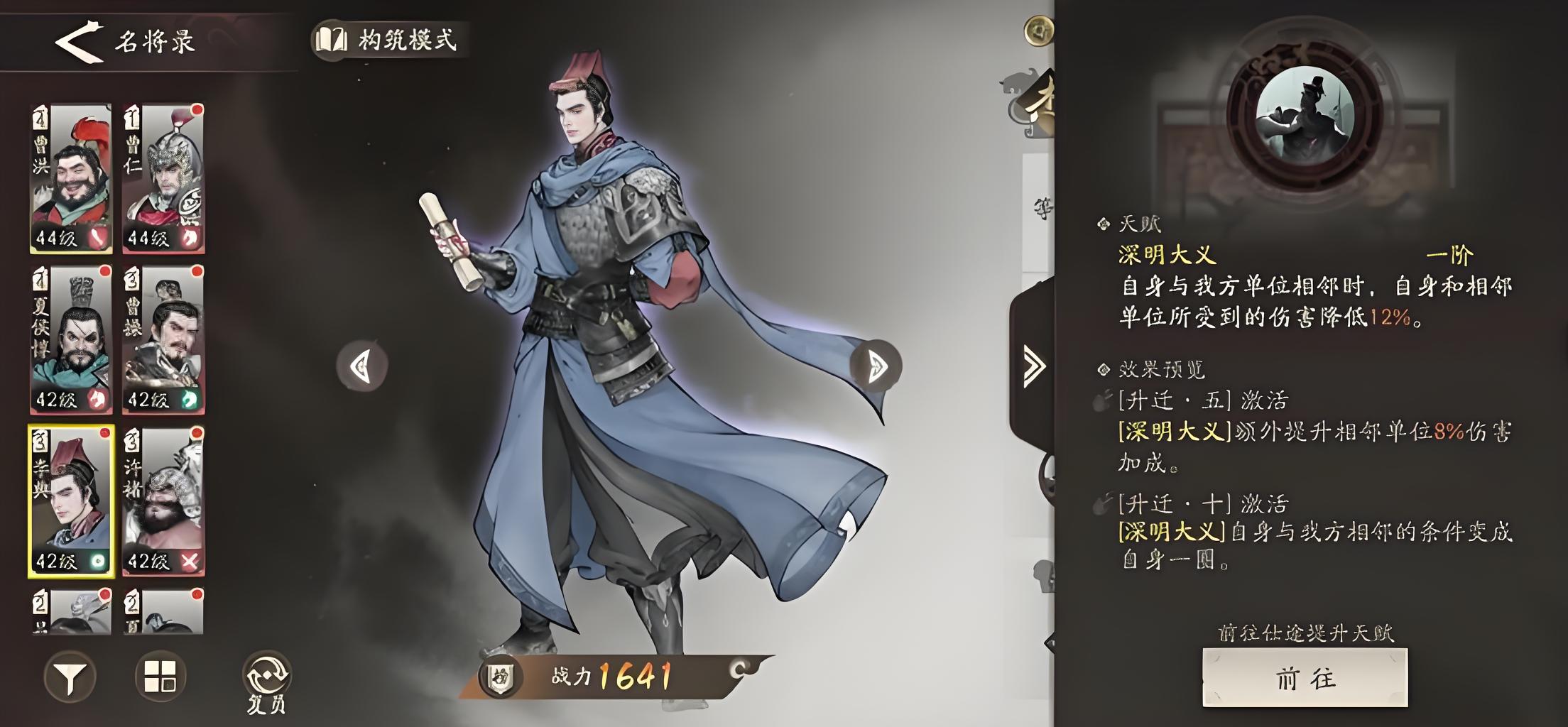 2、核心技能深明大义触发频率极高几乎每回合生效,随升迁等级强化,五阶额外提供伤害加成十阶扩大影响范围。