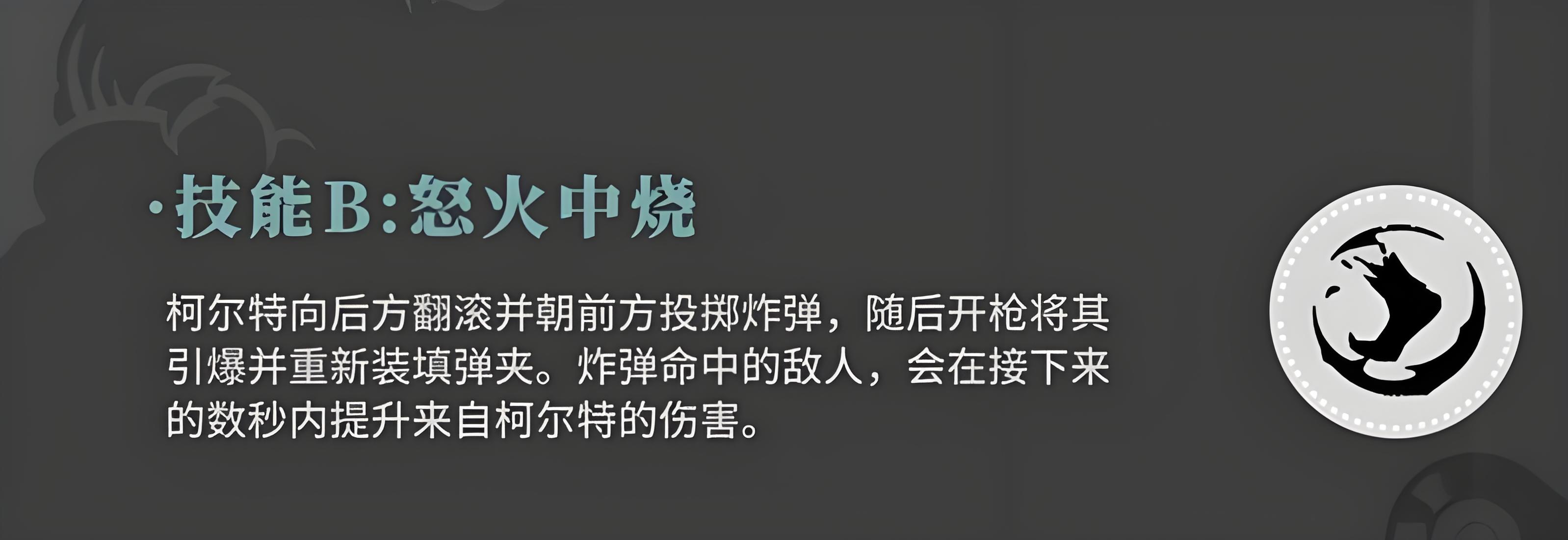 4、二技能怒火中烧有位移控场,释放后翻滚投炸弹需开枪引爆,命中造范围伤补弹匣还提后续伤害,适合起手拉开距离为衔接打基础。