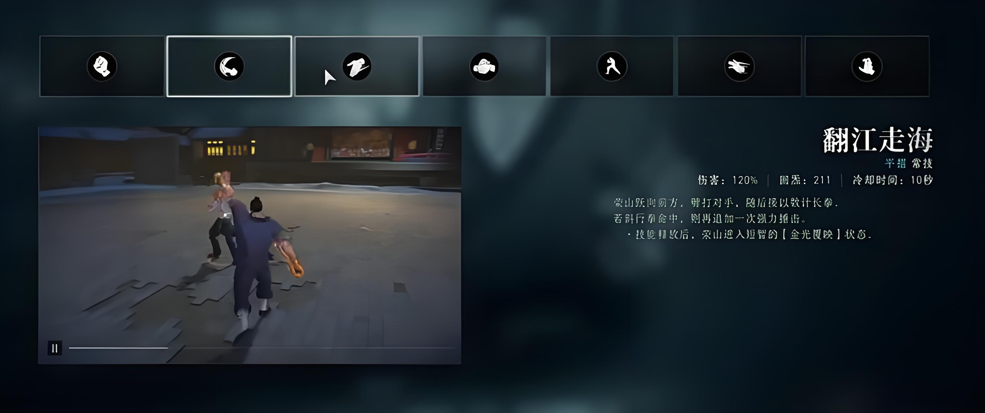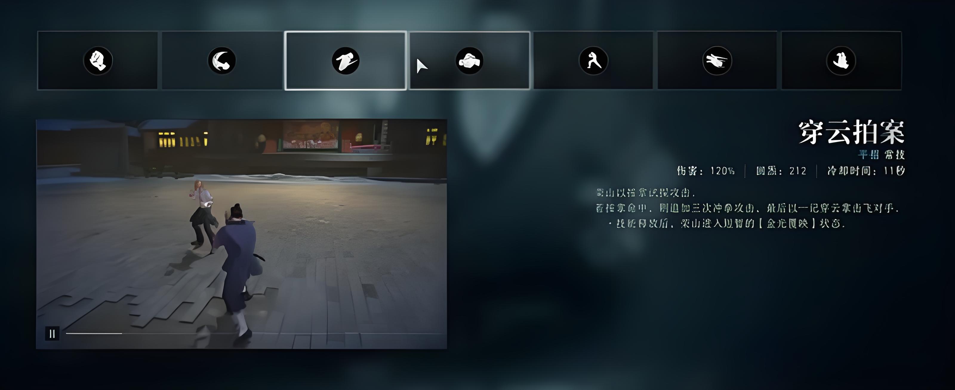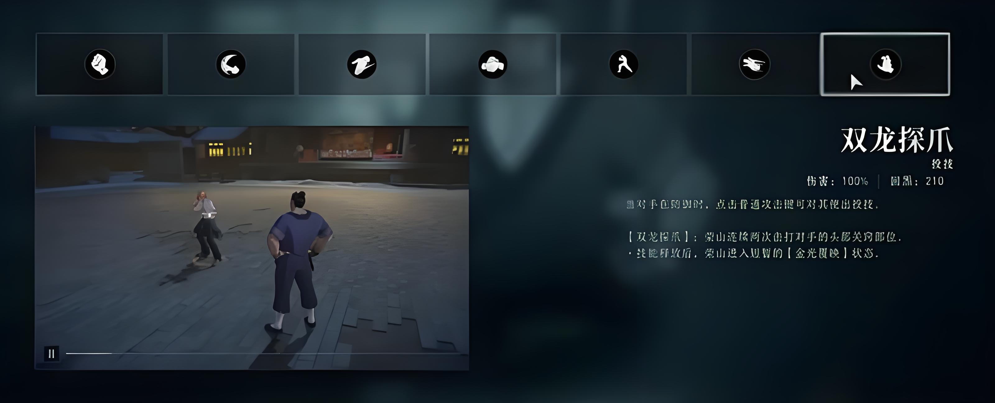 3、双龙探爪为单体投技需贴脸释放可无视防御抓取目标,穿云拍案是突进浮空技命中使敌人浮空便于衔接连招,二者释放后均让荣山进入短暂金光覆映状态。