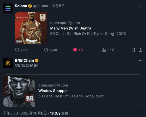 Solana 在社交平台分享美国说唱歌手 50 Cent 的《Many Men (Wish Death)》表达“未被打倒”的姿态,而 BNB Chain 则以 50 Cent 的《Window Shopper》回应,表现“我靠努力证明自己、回击看客”的姿态。双方既是相互追赶的对手,又是加密行业的同路人。