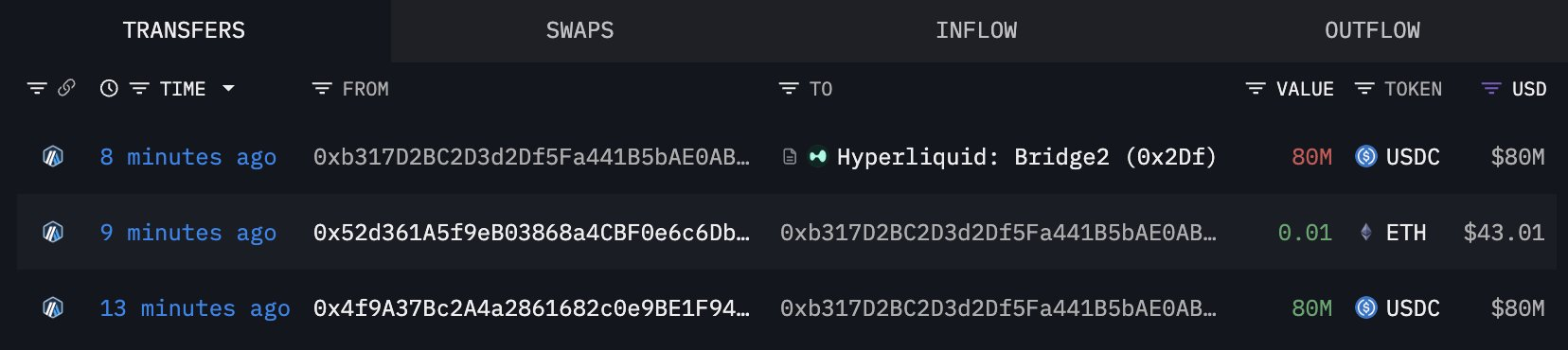 其先是向 Hyperliquid 存入 8000 万美元 ,开设了 3477 枚 BTC 的 6 倍空单;此外,还向币安存入了 5000 万美元的 USDC。地址:0xb317D2BC2D3d2Df5Fa441B5bAE0AB9d8b07283ae;