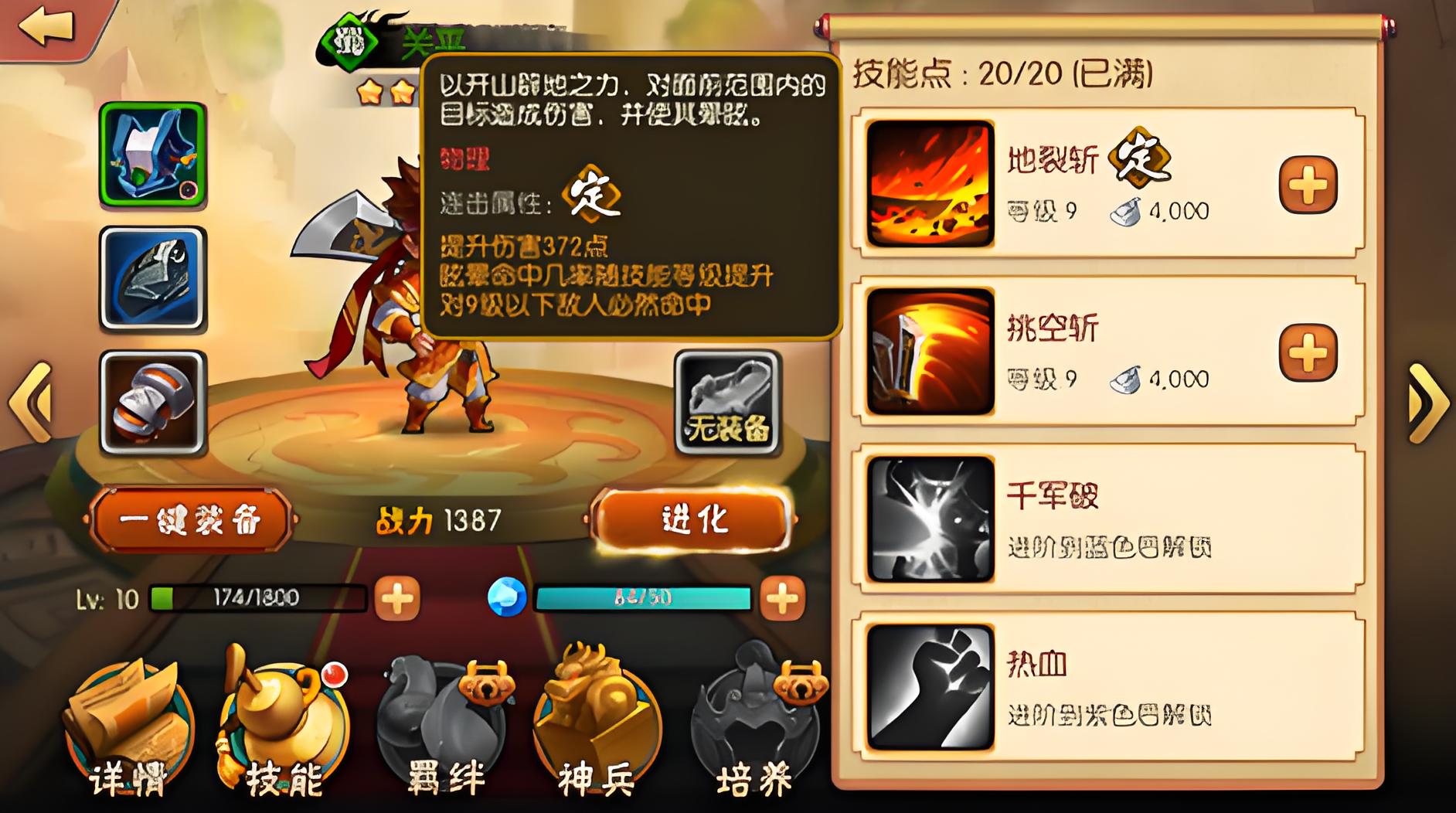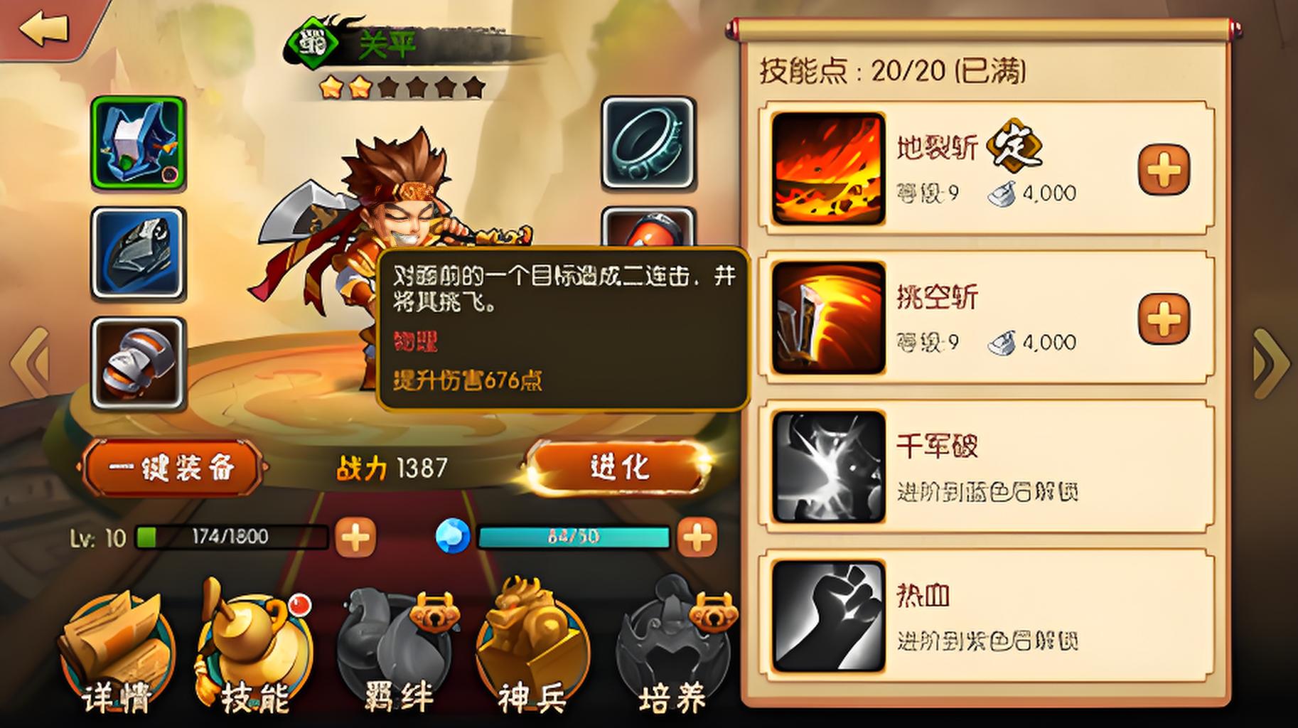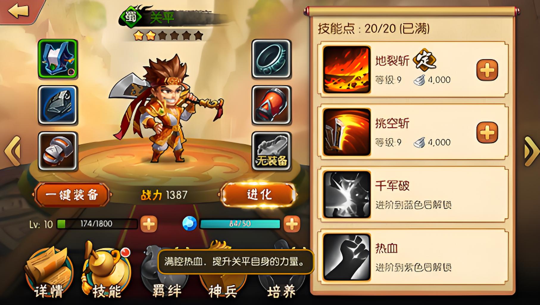 4、热血需进阶到紫色后解锁,能大幅提升关平自身力量属性,力量增长让他同时增强抗伤与输出能力,优化战场综合表现。