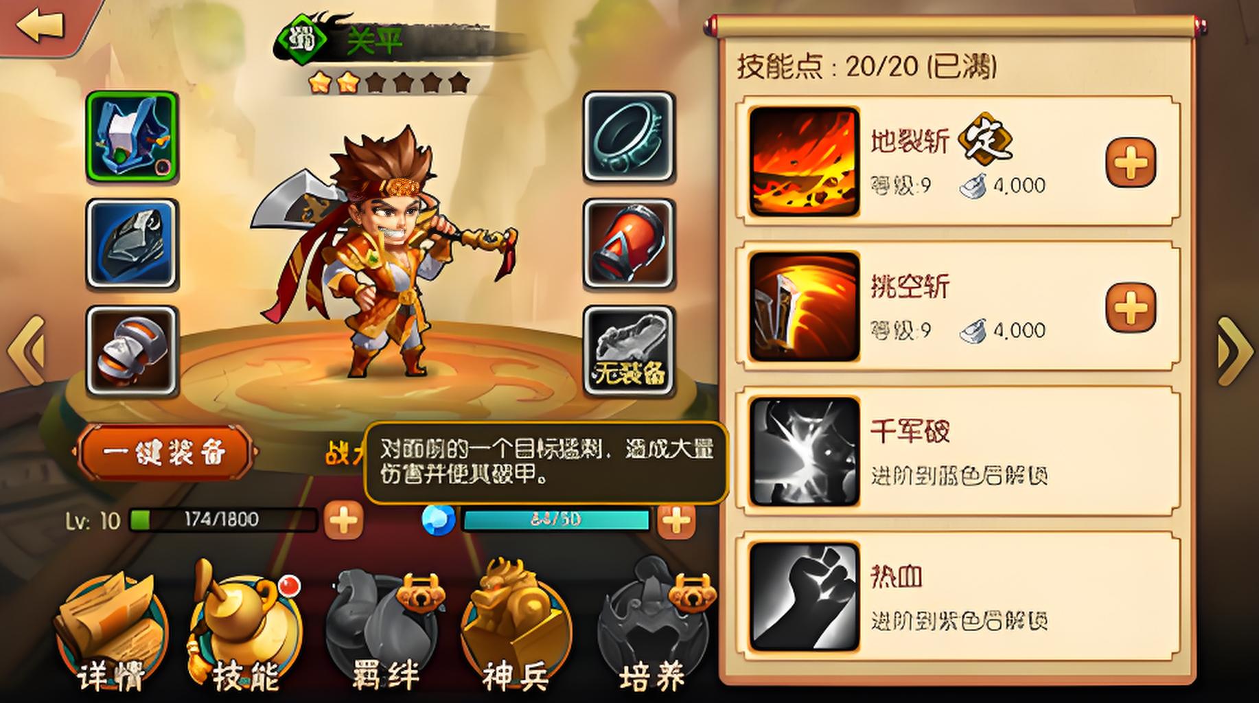 3、千军破需进阶到蓝色后解锁,对面前目标猛刺造成大量伤害并附加破甲效果,这一特性让他成为物理队的优质前排选择。