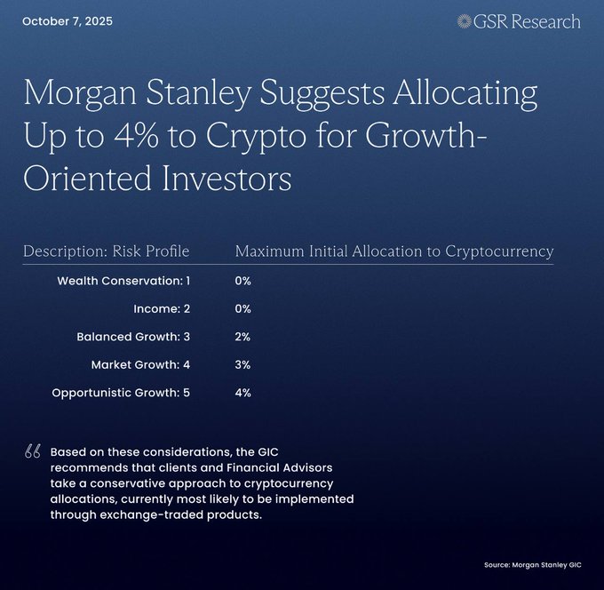 值得注意的是,摩根士丹利近期建议成长型投资者最高配置4%的加密资产,称这一比例适合追求机会性增长的客户。