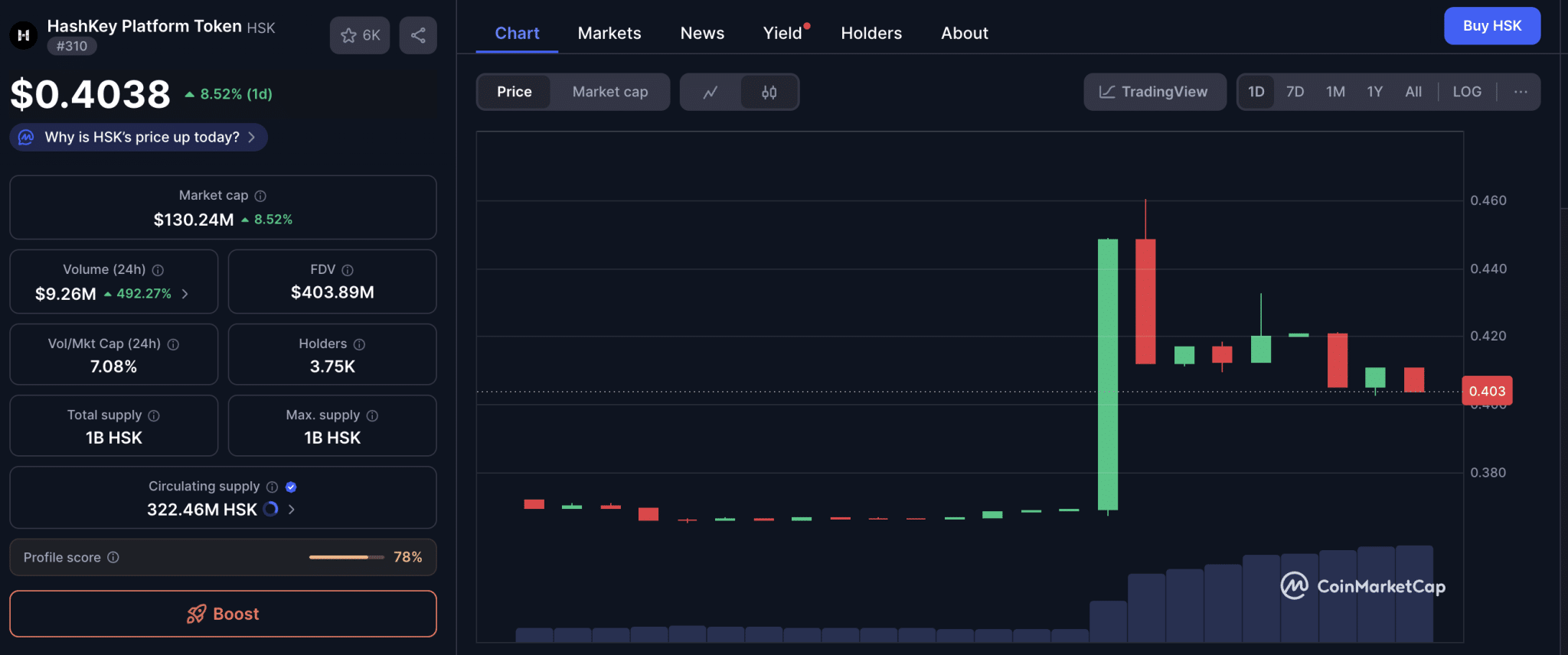 IPO消息公布后,HashKey生态代币HSK价格一度跃升13%至0.46美元,后稳定在0.41美元。这波短暂上涨反映市场乐观预期——成功上市将提升HSK的市场能见度并强化其在HashKey生态中的作用。