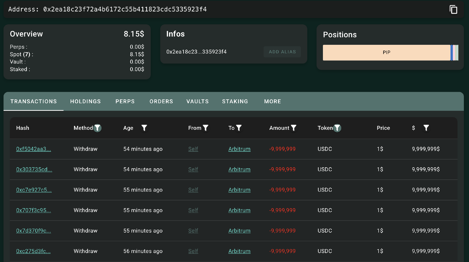 简单举个例子,Hypurrsan 资料显示,0x2ea18 开头的巨鲸地址过去 24 小时透过做空 BTC 和 ETH 盈利 7233 万美元,该巨鲸已将 6000 万美元 USDC 提回 Arbitrum,落袋为安。