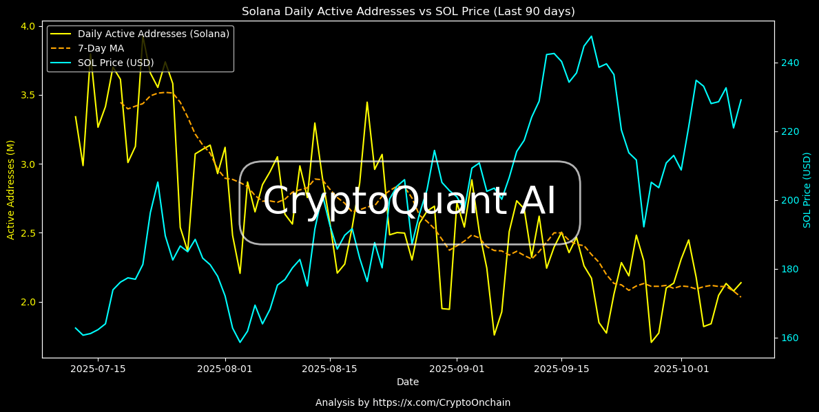 该分析基于"Solana每日活跃地址数vs币价"指标,追踪过去90天内SOL市场价格与网络交互独立地址数量的关联性。