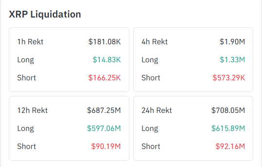 过去24小时,这轮回调导致价值7.08亿美元的XRP仓位爆仓。其中6.15亿美元为多头仓位,9200万美元的后期空头也未能幸免。