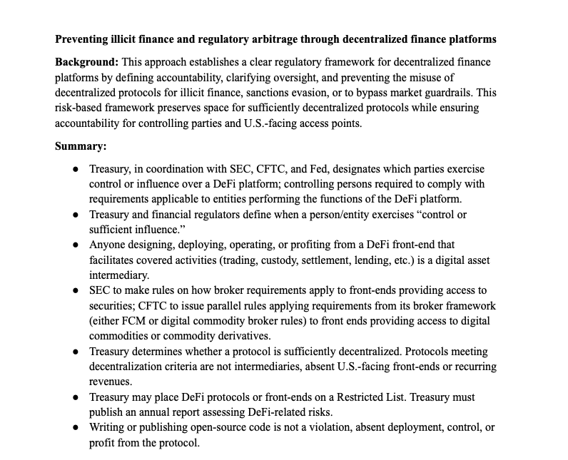 这份名为《通过去中心化金融平台预防非法融资与监管套利》的六页文件提出,通过"明确责任、厘清监管权限、防止去中心化协议被用于非法融资、逃避制裁或绕过市场护栏",为DeFi平台建立"清晰"的监管框架。