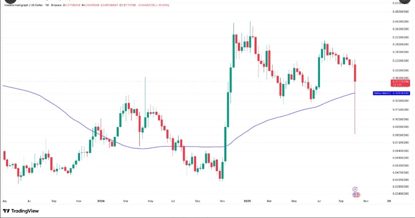 Hedera自2024年11月以来首次触及100周移动平均线,在其长期图表上标记出关键技术里程碑。该代币从0.215美元跌至0.1685美元,日内跌幅高达21.7%,反映市场整体波动加剧。位于0.145美元附近的100周均线现成为重要技术支撑区,长期交易者正密切关注该区域的稳定性。