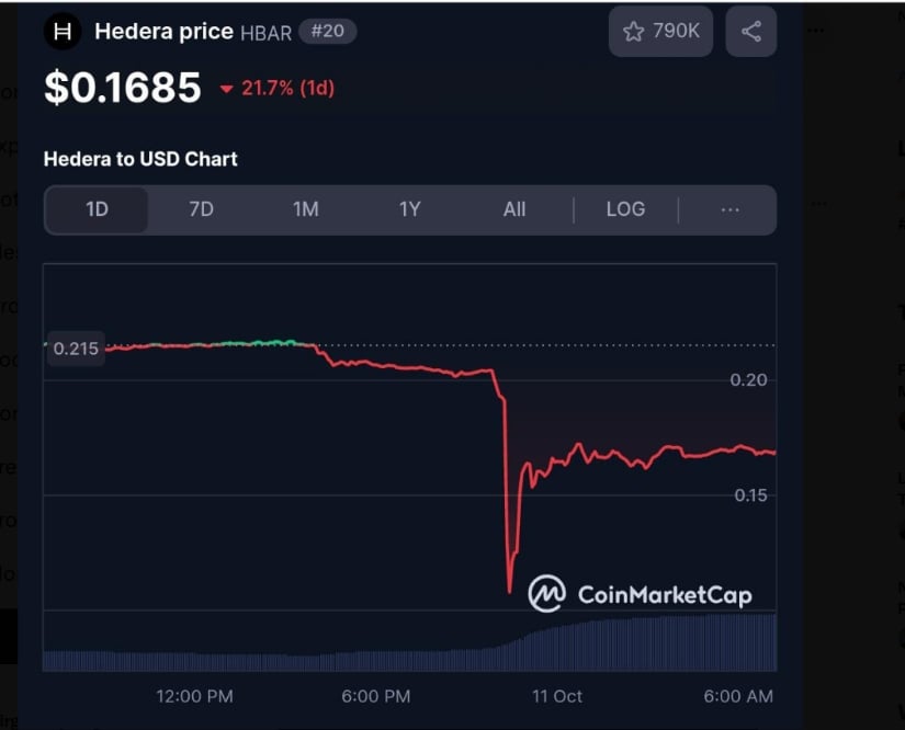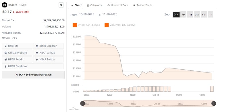 Hedera在下跌期间录得近7.96亿美元交易量,较近期平均水平显著上升。这一激增反映交易所广泛的平仓活动和短期恐慌。尽管遭遇激进下跌,该代币仍在0.17美元附近获得暂时稳定。其市值现约70.9亿美元,位列加密货币前30强。