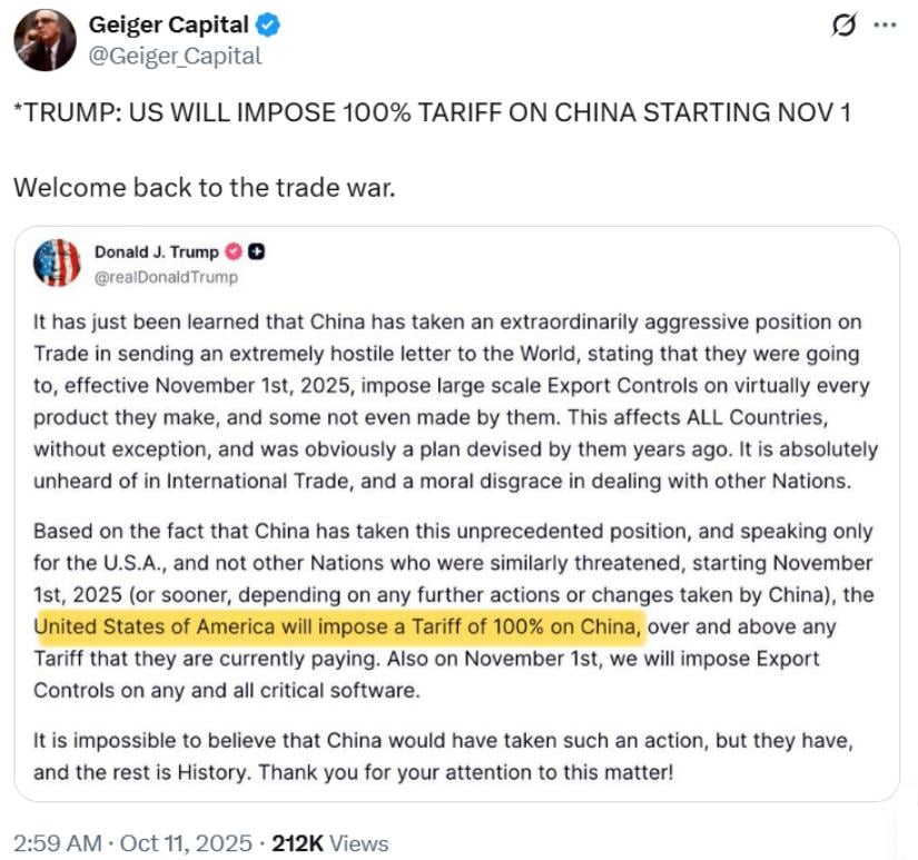 特朗普宣布自11月1日起对中国征收100%关税,重燃新贸易战与市场动荡忧虑。来源:@Geiger_Capital via X