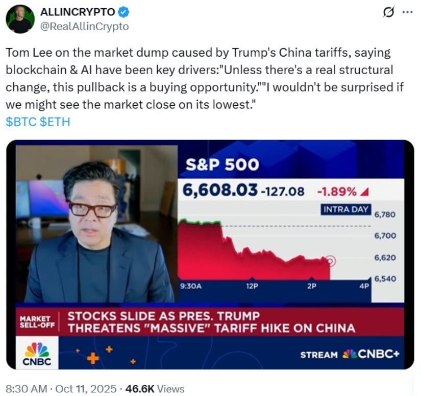 Tom Lee将关税引发的比特币下跌视为潜在买入机会,指出区块链与AI是长期市场关键驱动力。来源:@RealAllinCrypto via X