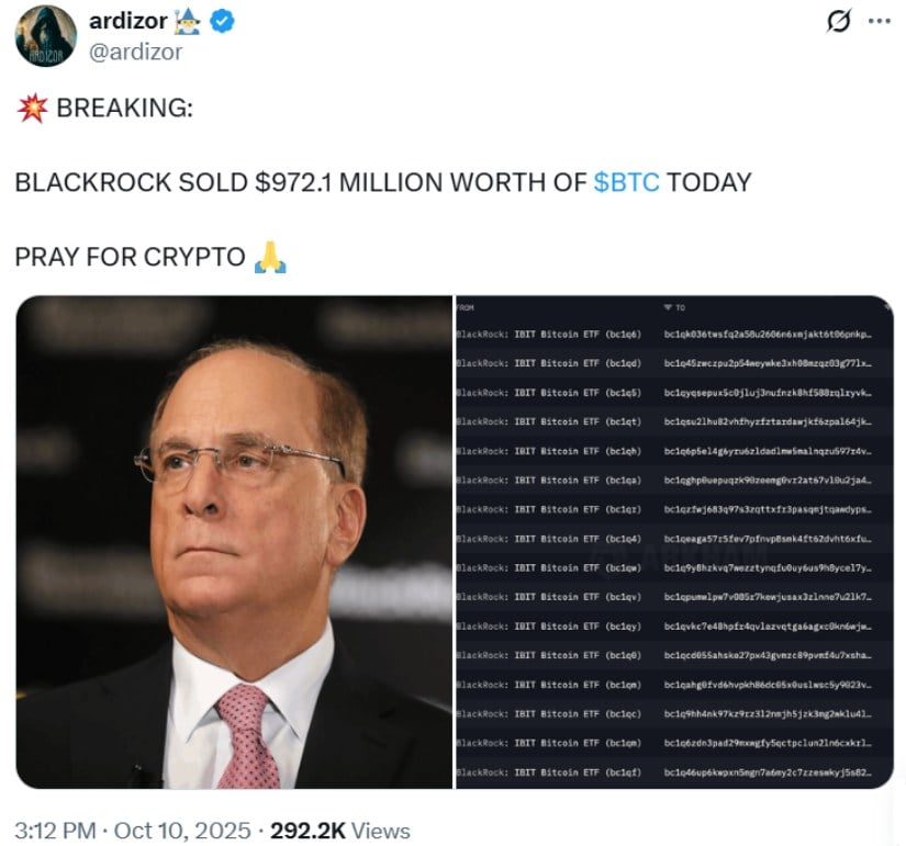 贝莱德今日抛售9.721亿美元比特币,引发市场不安并使机构资金流重获关注。来源:@ardizor via X