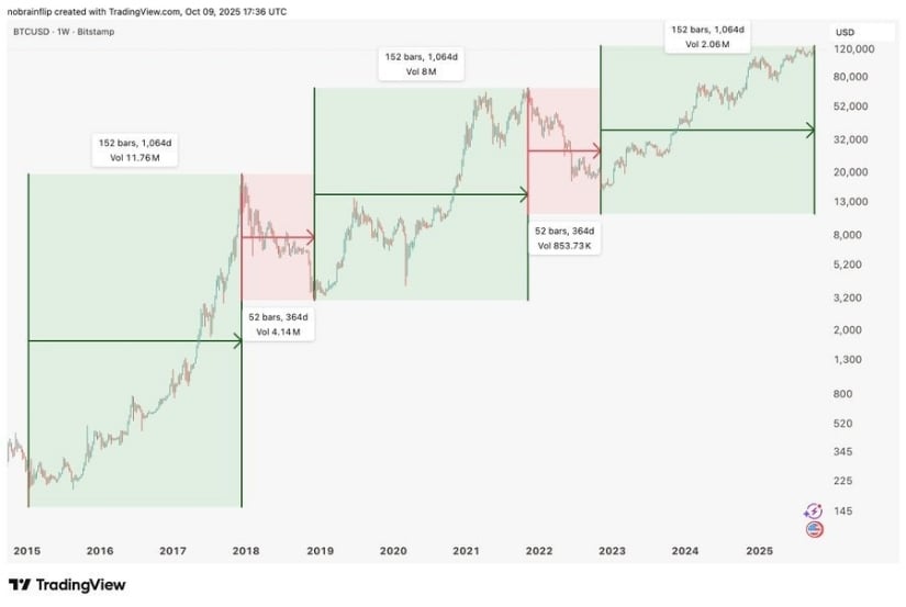 加密分析师@nobrainflip分享的宏观视角指出,比特币存在1064天牛市周期与364天回调周期的重复模式。若该结构成立,当前始于2022年11月21日熊市低点的牛市,可能在2025年10月初见顶——恰好与当前波动期吻合。
