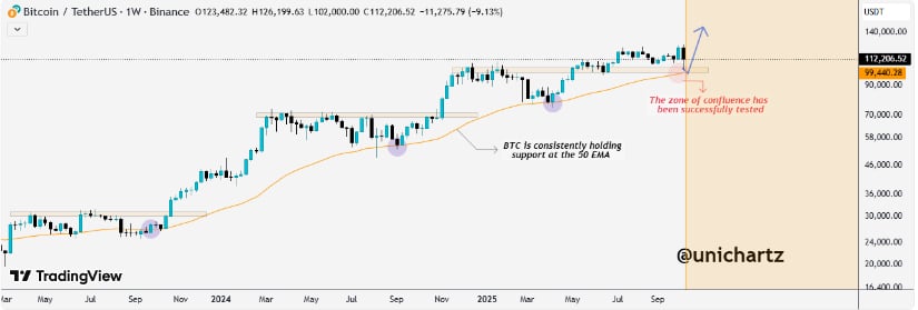 比特币持续在50日均线获得支撑,测试12.6万美元阻力位时显示看涨动能。来源:TradingView上的unichartz