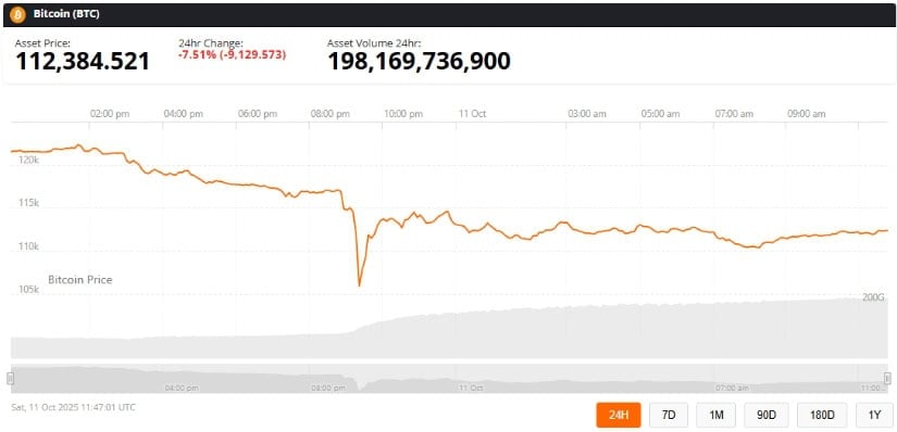 截至发稿时,比特币(BTC)交易价格约为112,384美元,24小时下跌7.51%。来源:Brave New Coin比特币价格