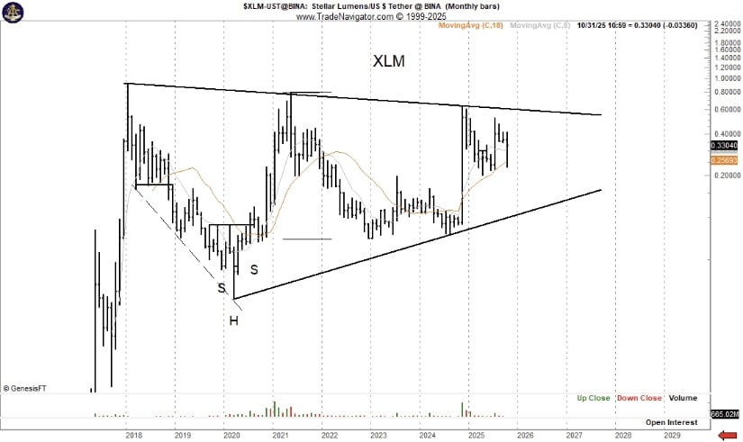 图表分析大师Peter Brandt在周末的X平台发文中,引用恒星币的长期结构指出"午睡醒来的公牛"恰能描述该资产当前阶段。他附上的多年走势图显示出一个大型对称三角形,底部正在形成头肩底反转形态——这种组合通常预示着重大市场转折。