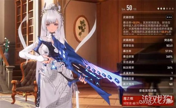 圣裁步枪:这就是突击枪里面的万金油武器,子弹就可以跟着准心走,暴击倍率还是比较高的,而且还会有20%的切割攻击加成。中远距离在打精英怪或者是boss时爆发伤害又快又准。武器技能还可以直接增加50%的暴击率,在发射的时候射线命中之后就可以直接弹到周围4个敌人。水属性角色直接用它暴击,那队友就可以增加58%的攻击力。攻击力的数值是103.61,暴击率会达到57.5%,所以不管是单打独斗还是组队都是比较好用的。