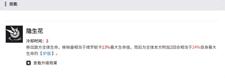 2、核心技能隐生花冷却三回合,持续扣目标相当于自身20%最大生命值的血量,同时为全体友方加等量护盾,攻防一体适配团战需求。