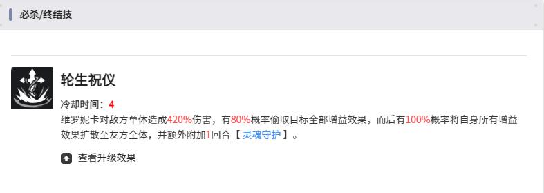 3、终极技能转生祝仪冷却四回合,对单一敌人造成420%攻击力爆发伤害,抽取目标所有增益转至我方全体,还触发灵魂守护为队友回血。