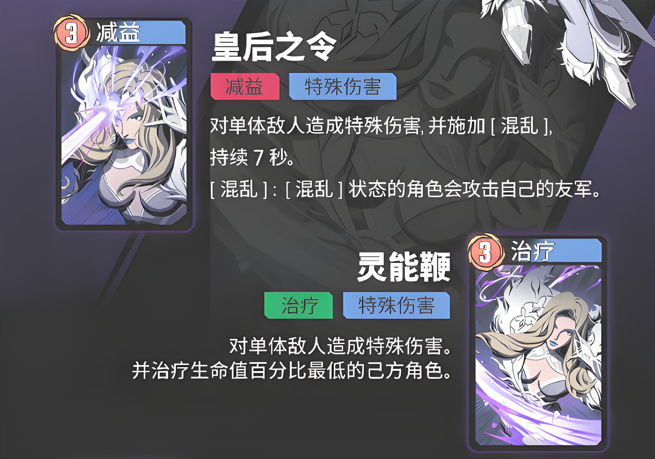 1、主动技能皇后之令可对单体敌人造成特殊伤害,施加持续7秒的混乱状态,处于混乱状态的角色会攻击自身友军,该技能属于减益类技能。