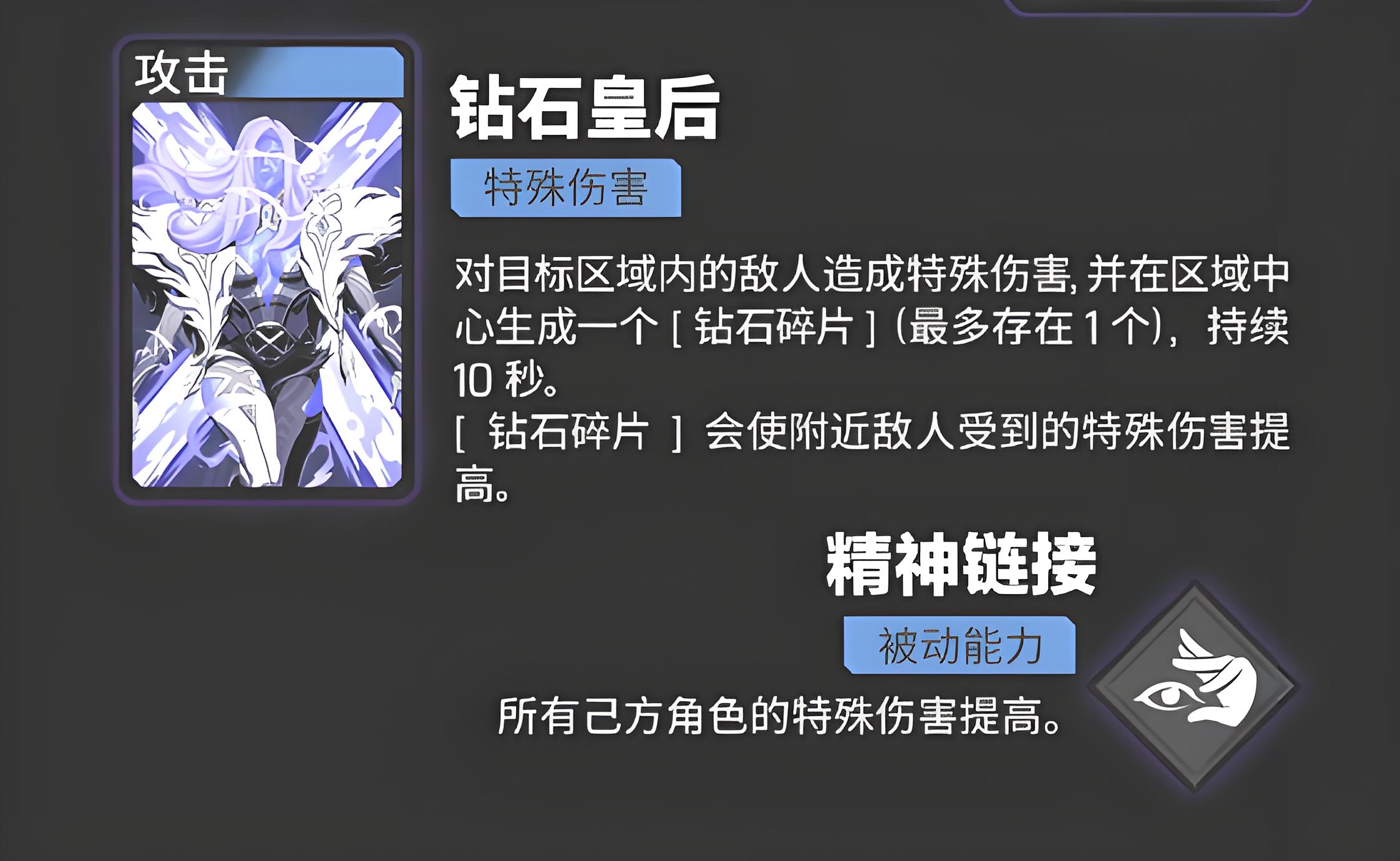 3、主动技能钻石皇后对目标区域内敌人造成特殊伤害,区域中心生成持续10秒的钻石碎片,可提高附近敌人受到的特殊伤害。