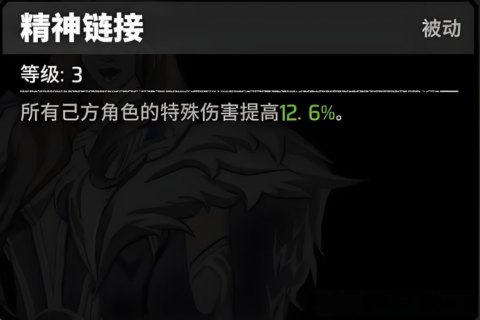 4、被动技能精神链接能让所有己方角色特殊伤害提高,适用于所有伤害类型为特殊伤害的角色,帮助队伍整体输出提升。
