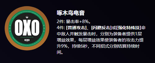 2、4件:[普通攻击]、[闪避反击]或[强化特殊技]命中敌人并触发暴击时,分别为装备者提供1层增益效果,每层增益效果使装备者的攻击力提升9%,持续6秒,不同招式分别结算持续时间。