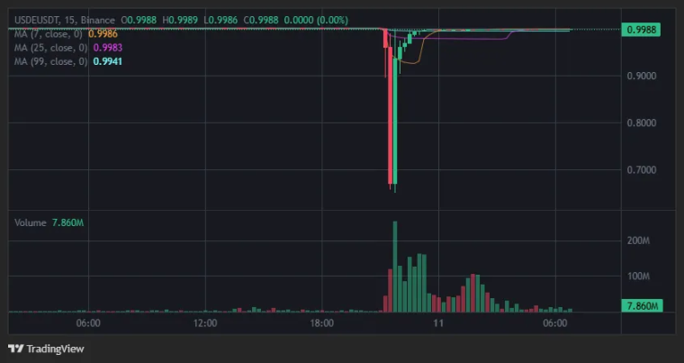 我看到很多关于 Ethena 在这个週末市场混乱期间脱锚的讨论。情况是 USDe(Ethena 发行的稳定币)曾短暂脱锚至约 0.68 美元,随后有所回升。这是大家都在引用的币安图表: