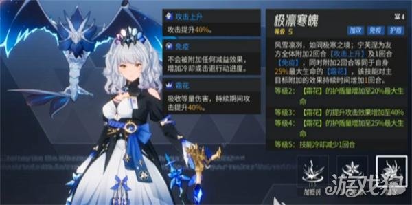 宁芙涅为友方全体附加两回合攻击上升以及免疫,同时附加两回合等同于自身25%最大生命的霜花,霜花能够吸收等量伤害且持续期间攻击提升40%;技能主目标的霜花维持回合+1