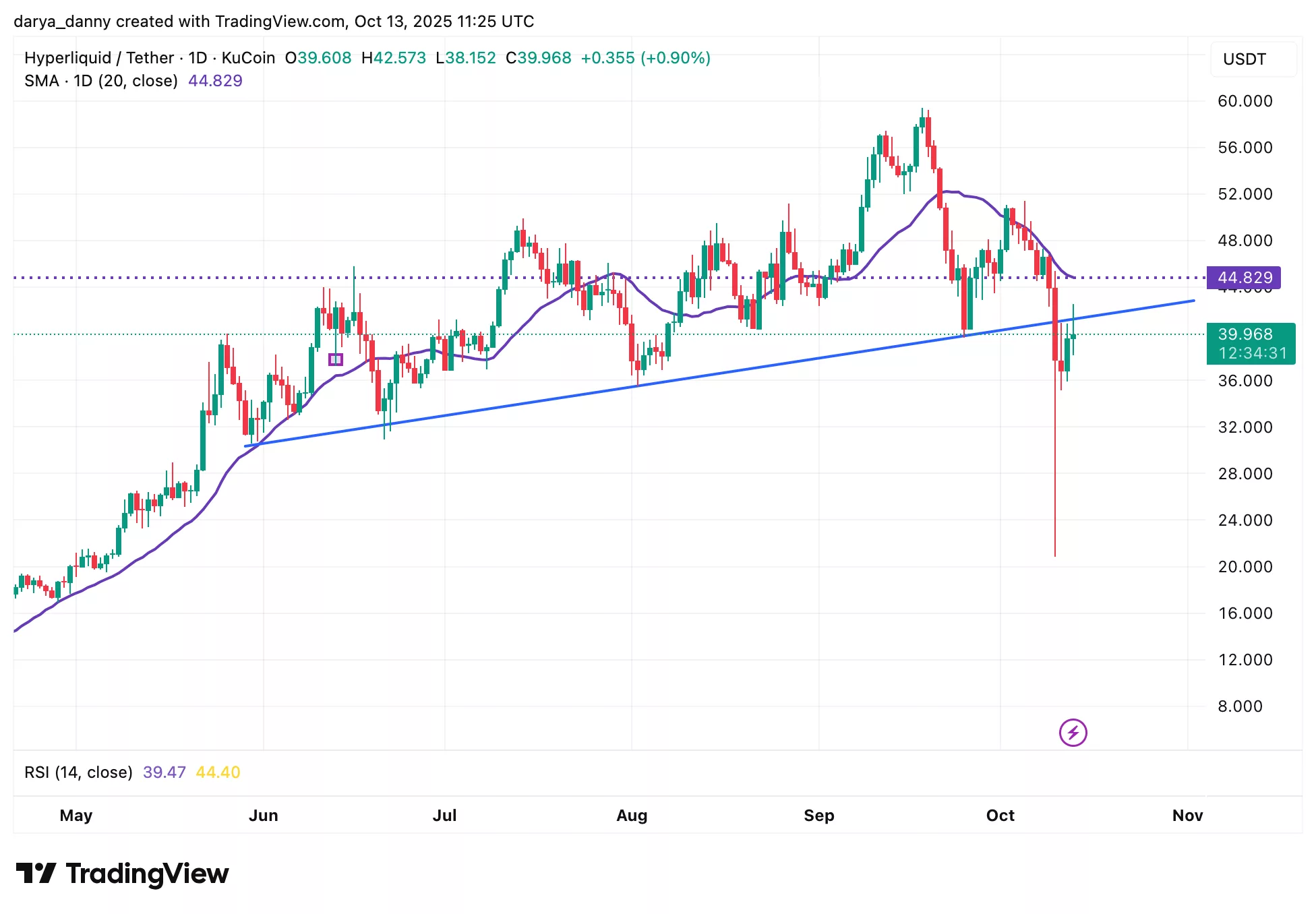 - HYPE价格已从20美元反弹至42美元,正试图突破与20日移动均线重合的45美元阻力位