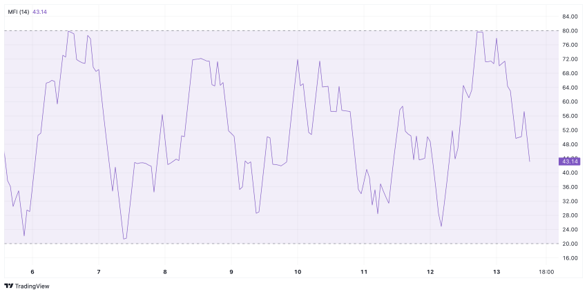 技术指标显示复苏迹象。资金流量指数(MFI)和相对强弱指数(RSI)谨慎指向看涨势头,但尚未进入极端区域。截至撰稿时RSI为56.42,MFI则处于中性区间。此前超买区域的购买压力已有所回落。